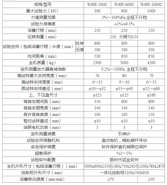 1.WAW-300C/600C/1000C型微機(jī)控制電液伺服萬能試驗(yàn)機(jī),采用油缸下置式主機(jī),拉伸空間位于主機(jī)的上方,壓縮彎曲試驗(yàn)空間位于主機(jī)下橫梁和工作臺之間油缸活塞采用間隙密封經(jīng)久耐用